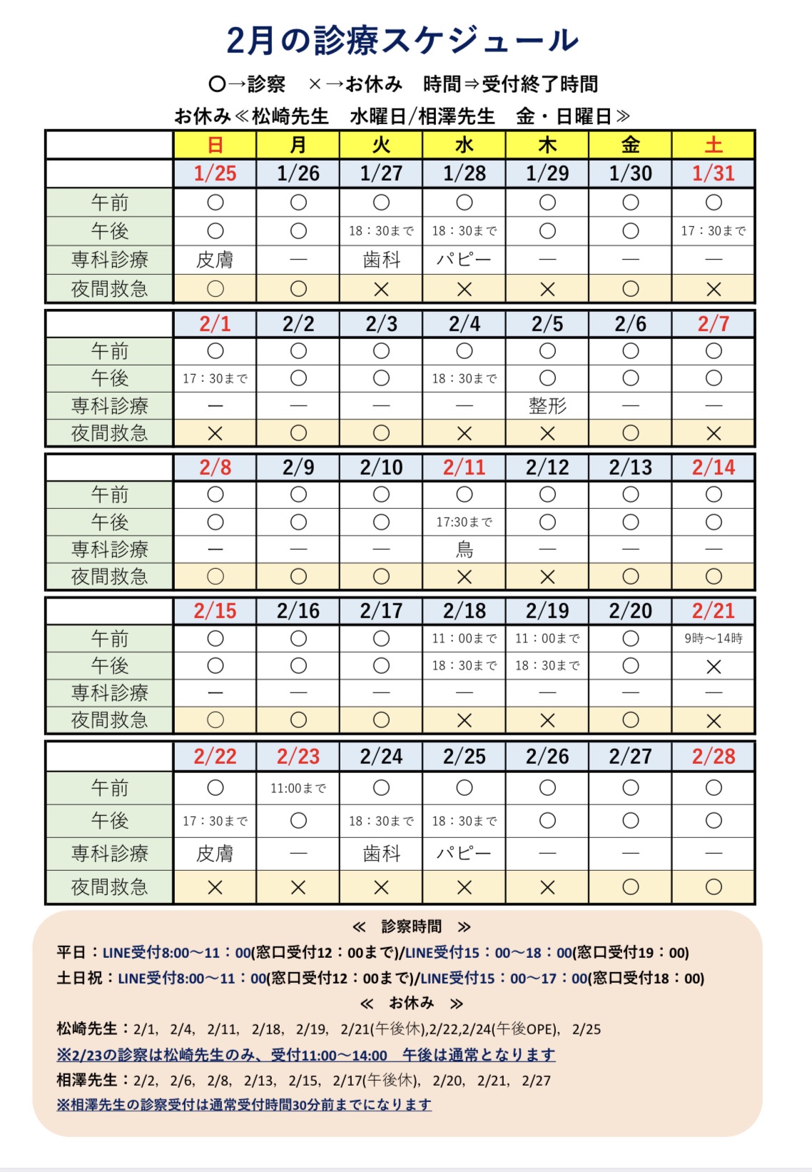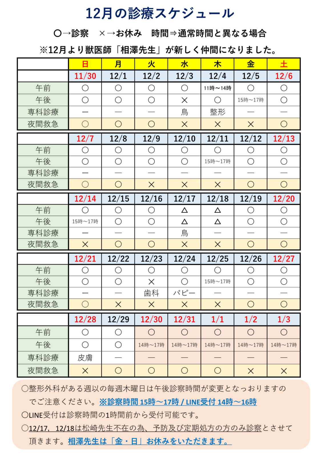 ご了承ください。診察は午後の診察が「×」になっていても病院か看護師、トリマーが在中していますのでトリミングやフード・予防薬購入、ホテルなどの使用はこれまで通りの時間帯でご対応いたします。