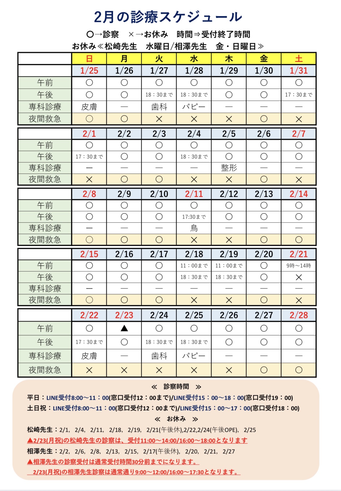 〇2/23(月祝)は獣医師によって診察時間が変わりますのでご注意ください。
